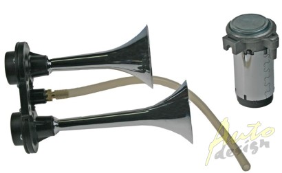 2-trubková fanfára poháněná vzduchovým kompresorem dodávaným v sadě. Trubky jsou vyrobeny z velice odolné zinkové slitiny a povrch je pochromován. Základní zvuk fanfár je dán kolísavým tónem obou trubek. V sadě jsou dodávány také hadice a drobný montážní materiál.