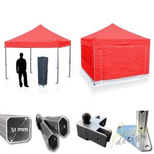 Konstrukce rámu RedX® PROFI KOMPAKT Konstrukce je vyrobena z kvalitního hliníku typu 6063, šestihranný profil nohou rámu, Ø 45mm. Váha rámu (konstrukce): 1,5mx1,5m: 18kg 2mx2m: 22kg 3mx2m: 29kg 3mx3m: 26kg 4,5mx3m: 34kg Výška rámu (konstrukce) ve složeném (neotevřeném) stavu: 102cm. Klouby a spoje vyrobeny z NYLONU vyztuženého UHLÍKOVÝMI VLÁKNY zajišťujícími vysokou flexibilitu materiálu. Tyto klouby jsou téměř nezničitelné. Na klouby poskytujeme ZÁRUKU 10 LET. 5 úrovní volitelných výškových nastavení na každé noze pomocí jednoduchého mechanismu, který uvolňuje zamykací systém v kloubech pomocí vytažení pojistky. Jedná se o kvalitnější, rychlejší a pro uživatele přívětivější variantu v porovnání s tradičnější “zamačkávací” metodou, při které trpí (kromě nervů) především prsty uživatele. Volitelná výška spodní hrany lemu střechy: min. 170 cm – max. 200 cm. Volitelná výška samotného vrcholu stanu: min. 303 cm – max. 333 cm. Každá noha je zakončena extra velkou pozinkovanou kovovou “patkou”, poskytující stabilitu konstrukce. Skrz tyto patky se také stan ukotvuje. Celá konstrukce drží pohromadě díky samozamykacím vrutům, které jsou bezpečně a pevně zapuštěny v nylonových kloubech a spojích. Centrální vertikální vzpěra s vestavěnou vnitřní pružinou – tvoří střed konstrukce a zajišťuje ideální napnutí střechy. Střešní opláštění RedX® PROFI Střecha je vyrobena z POLYESTERU s vnitřním PVC potahem, 100% voděodolný materiál se sníženou hořlavostí, hustota vláken je 600D Denier. Váha střešního opláštění: 1,5mx1,5m: 3kg 2mx2m: 4kg 3mx2m: 5kg 3mx3m: 6kg 4,5mx3m: 8kg Váha opláštění střechy je 380g na metr čtvereční střešní plochy. Zdvojený materiál na zvlášť namáhaných místech (vnitřní rohy střechy, atd.). Systém suchých zipů ke správnému uchycení a napnutí střechy na hliníkovou konstrukci. Dvojité prošívání na zvlášť namáhaných místech. Švy tepelně podlepené TPU páskou pro 100% voděodolnost. Kotvící poutka na 4x rozích lemů střechy k připevnění kotvících lan. Možnost potisku střechy stanu metodou vinylového tepelného transferu nebo digitální sublimací. Velký výběr barevných kombinac