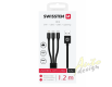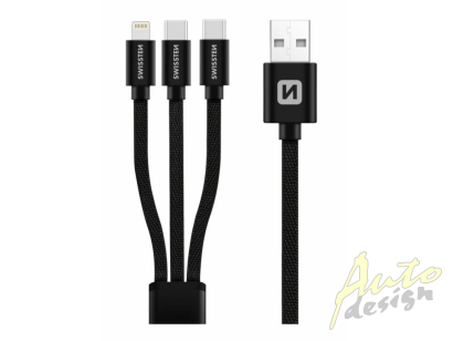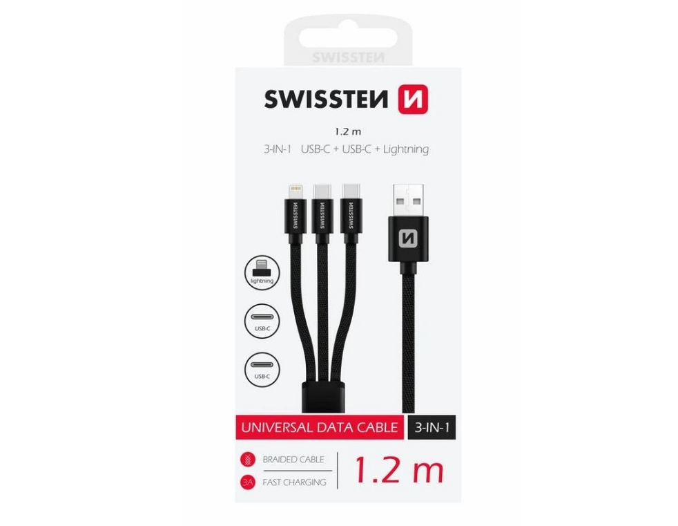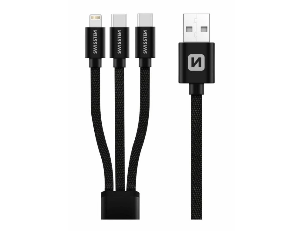 Kabel textile 3v1 2x USB-C, 1x Lightning, 1,2 m, SWISSTEN černý
