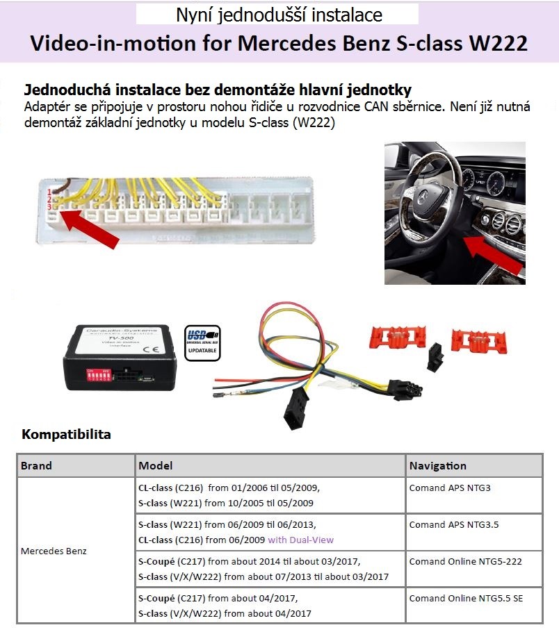 Kabeláž pro připojení modulu TVF-box01 do Mercedesu s navigací Comand APS NTG3 a Comand APS NTG3,5, NTG5-222 a NTG 5,5 SE.