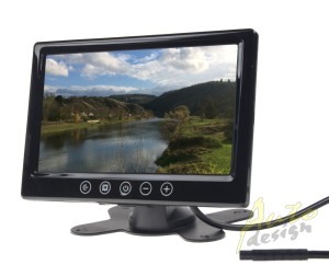 Ekonomická varianta 2 vstupového monitoru. LCD monitor 7" pro zabudování do opěrky nebo pro uchycení na držák, plastový rámeček pro zabudování do opěrky, bez protisluneční clony, širokým úhlem pohledu a displej s vysokým rozlišením. Technické parametry - rozlišení 800 x 480 - formát 16:9 - dálkové ovládání - podporuje formáty PAL/NTSC - 2 x RCA video vstup - napájecí napětí 12-24 V / 4,8 W - ovládací vodič na zpětnou kameru - možnost přetočení obrazu - v balení: rámeček pro instalaci do opěrky, držák monitoru na palubní desku, nap. kabel, dálkové ovládání - rozměry 180 x 122 x 26 mm, rámeček: vnější 205 x 146 x 25 mm, do otvoru 185 x 125 x 20 mm *Technické specifikace a obrázky jsou převzaty od výrobce a mají výhradně informativní charakter!