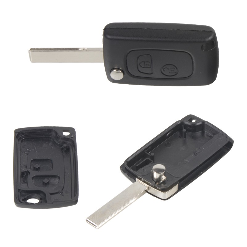 Náhradní obal vystřelovacího klíče pro vozy Citroën/Peugeot s 2-tlačítkovým nevystřelovacím klíčem (bez elektroniky a čipu imobilizéru). Slouží pro změnu ze staršího nevystřelovacího klíče na novější verzi s vystřelovacím klíčem. Do vystřelovacího klíče je nutno vložit z původního klíče elektroniku dálkového ovládání a čip imobilizéru (transpondér), planžetu klíče je třeba nechat vyfrézovat podle tvaru originálního klíče. Typ planžety: HU83.