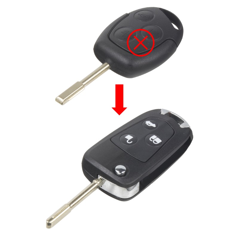 Náhradní obal vystřelovacího klíče Ford s 3-tlačítkovým nevystřelovacím klíčem(bez elektroniky a čipu imobilizéru). Slouží pro změnu ze staršího nevystřelovacího klíče na novější verzi s vystřelovacím klíčem. Do vystřelovacího klíče je nutno vložit z původního klíče elektroniku dálkového ovládání a čip imobilizéru (transpondér), planžetu klíče je třeba nechat vyfrézovat podle tvaru originálního klíče.