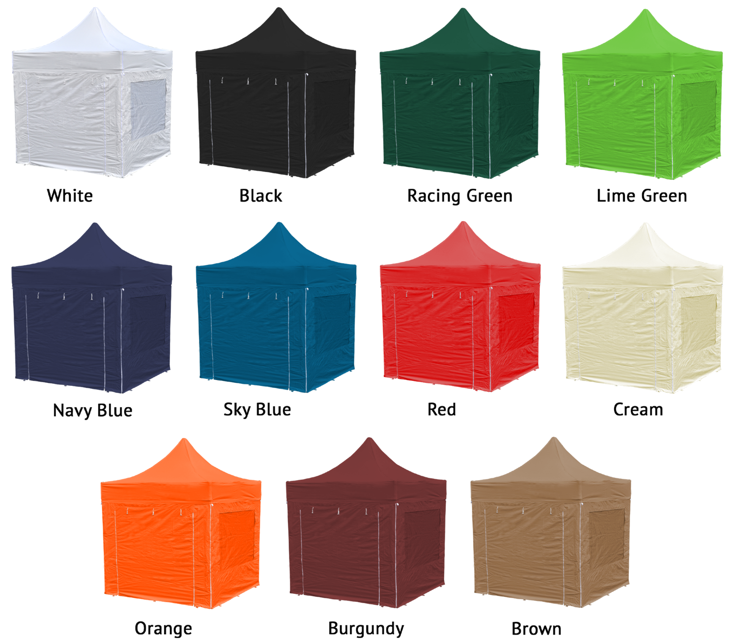 380g polyester, vnitřní pryžový povlak pro maximální pevnost a ochranu před deštěm, teplovzdušné pásy, plně vodotěsné. Jsou opatřeny očky pro připevnění k rámu pomocí šroubovacích kuliček, které zabraňují hromadění vody v rozích. Zpomalování hoření podle normy: BS7837: 1996.