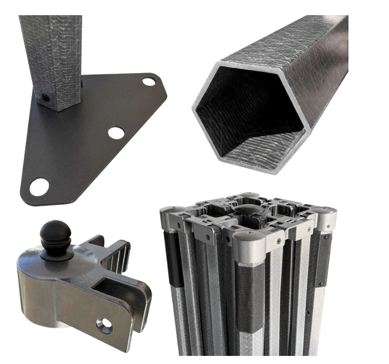 - Konstrukce je vyrobena z kompozitního materiálu (cca. 30% vinyl + cca. 70% skelné vlákno), šestihranný profil nohou rámu, Ø 57mm.