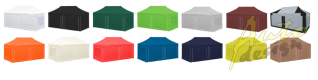 - Plná sada je kombinací 6 ks samostatných bočnic (POLYESTER s vnitřním PVC potahem) - kombinace 2 ks oken s vnitřními roletami (šířka 3m), 2 ks rolovacích extra širokých dveří zapínatelných pomocí kvalitních zipů (šířka 3m) a 2ks plných bočnic (šířka 3m).