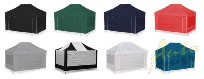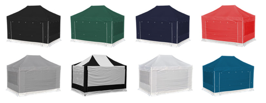 - Plná sada je kombinací 4 ks samostatných bočnic (POLYESTER s vnitřním PVC potahem) - kombinace 2 ks oken s vnitřními roletami (šířka 4m) a 2 ks rolovacích extra širokých dveří zapínatelných pomocí kvalitních zipů (šířka 6m).