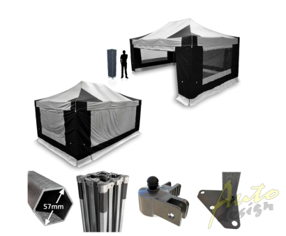 - Plná sada je kombinací 4 ks samostatných bočnic (POLYESTER s vnitřním PVC potahem) - kombinace 2 ks oken s vnitřními roletami (šířka 4m) a 2 ks rolovacích extra širokých dveří zapínatelných pomocí kvalitních zipů (šířka 6m).
