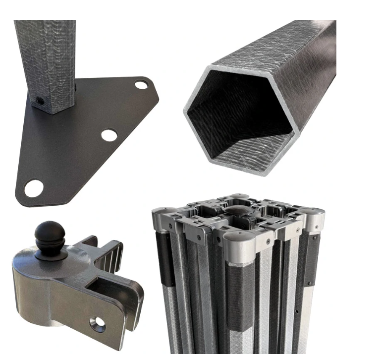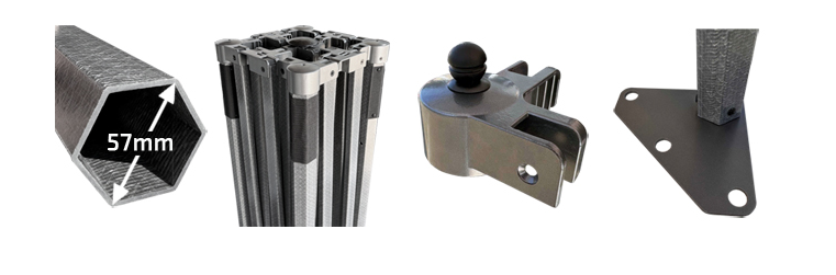 - Konstrukce je vyrobena z kompozitního materiálu (cca. 30% vinyl + cca. 70% skelné vlákno), šestihranný profil nohou rámu, Ø 57mm.