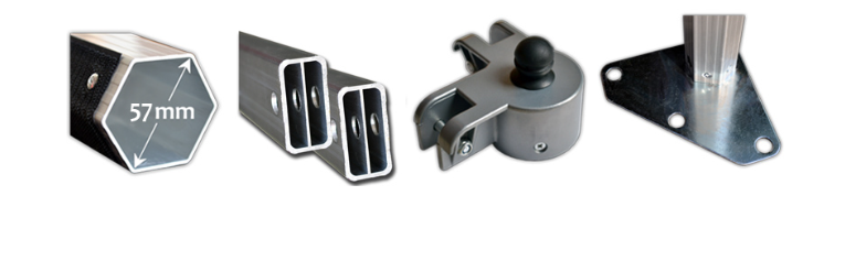 - Konstrukce je vyrobena z kvalitního hliníku typu 6063, šestihranný profil nohou rámu, Ø 57mm.