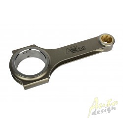Sada kovaných ojnic značky JRspec vyrobených pomocí technologie H-beam pro vozidla BMW M50 / M54 Vyrobené z vysoce kvalitní kované oceli ANSI4340 (EN24), pevnost přesahující 200 kW na cylindr.Před opracováním vakuově odplynované.Tepelně upravené (normalizované).Po úpravě povrchově zbroušené (odpružené).Zarovnané hrany.Každý otvor byl dvakrát honován (před a po opracování paty), což zaručuje ideální kruhový tvar (tolerance 0,01mm). Ojnice jsou vyrovnané (ideálně rovné v horizontále) do 0,01 mm – rozdíly u mnoha značkových výrobců překračují dokonce 0,1mm, což má za následek rychlejší opotřebení ložisek!Každá jednotlivá sada ojnice + pata má své individuální číslo. Sady jsou baleny podle váhy a vyvážené END to END. Hlavice jsou navíc posílené, obsahují bronzovou tulej v místě osazení svorníku pístu. Ojnice jsou testované na Calibře Tsunami s výkonem více než 1500 koní. Délka: 135mm Svorník: 22mm Šrouby: 3/8"