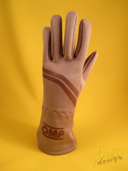 Hnědé rukavice OMP s homologací FIA Standard 8856-2000. Velikost 10/M