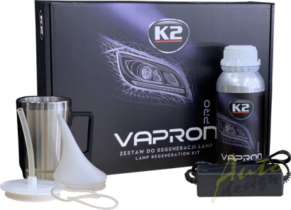 K2 Vapron je revoluční metoda regenerace poškozených světlometů bez nutnosti jejich demontáže. Souprava je založena na rekonstrukci průhledné polykarbonátové vrstvy (nejprůhlednějšího plastu použitého k výrobě krytů světlometů) nanesením nového tekutého polykarbonátového povlaku a přestavbou struktury stínítka lampy. K2 Vapron je profesionální sada pro regeneraci a ochranu poškozených světel, známá jako „čajová konvice“ nebo „kouzelná konvice“. Je ideální pro obnovu poškozených (matných, zažloutlých) světlometů bez ohledu na věk vozidla a stupeň poškození světel. Regenerace světlometů pomocí sady K2 Vapron je nejúčinnější a nejspolehlivější metodou renovace povrchu světlometu.