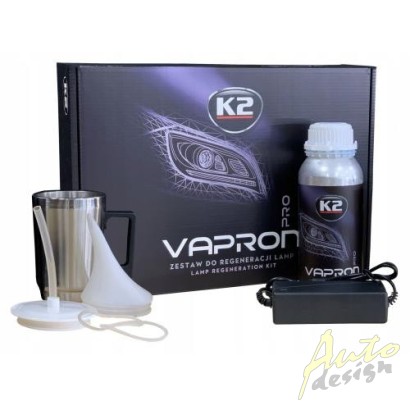 K2 Vapron je revoluční metoda regenerace poškozených světlometů bez nutnosti jejich demontáže. Souprava je založena na rekonstrukci průhledné polykarbonátové vrstvy (nejprůhlednějšího plastu použitého k výrobě krytů světlometů) nanesením nového tekutého polykarbonátového povlaku a přestavbou struktury stínítka lampy. K2 Vapron je profesionální sada pro regeneraci a ochranu poškozených světel, známá jako „čajová konvice“ nebo „kouzelná konvice“. Je ideální pro obnovu poškozených (matných, zažloutlých) světlometů bez ohledu na věk vozidla a stupeň poškození světel. Regenerace světlometů pomocí sady K2 Vapron je nejúčinnější a nejspolehlivější metodou renovace povrchu světlometu.