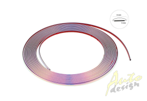 Pružný duhový dekorativní pás, který mění barvy v závislosti na úhlu pohledu nebo dopadu světla, od stříbrné po modrou, růžovou a fialovou - jako chameleon. Povrch lišty je odolný vůči povětrnostním vlivům, v balení je chráněn fóliovou membránou, kterou je nutné po instalaci odstranit. Montáž je velmi snadná. Pásek má ve spodní části silnou oboustrannou pásku. Má širokou škálu aplikací a lze jej použít jako: dekorace auta uvnitř - na palubní desce vnější dekorace vozu - na nárazníky a dveře dekorace jachet dekorace karavanu dekorace bytového zařízení Rozměry: šířka: 6mm Instalace: Důkladně očistěte povrch - odstraňte všechny stopy oleje a mastnoty. Umístěte proužek na tělo a označte místo. Odstřihněte proužek na vhodnou velikost (ponechte vzdálenost asi 1 cm). Odstraňte ochrannou oboustrannou pásku a proužek nalepte podél vyznačené linie. Prsty přitlačte pruh po celé jeho délce. Pozornost. Pás instalujte, když je teplota vzduchu vyšší než 18°C. Vyhněte se mytí vozu v automatické myčce několik hodin po instalaci. Cena uvedena za 1bm